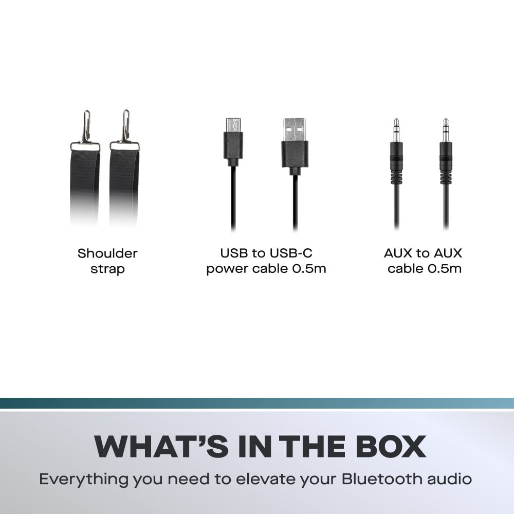 - Includes USB charging cable and AUX cable