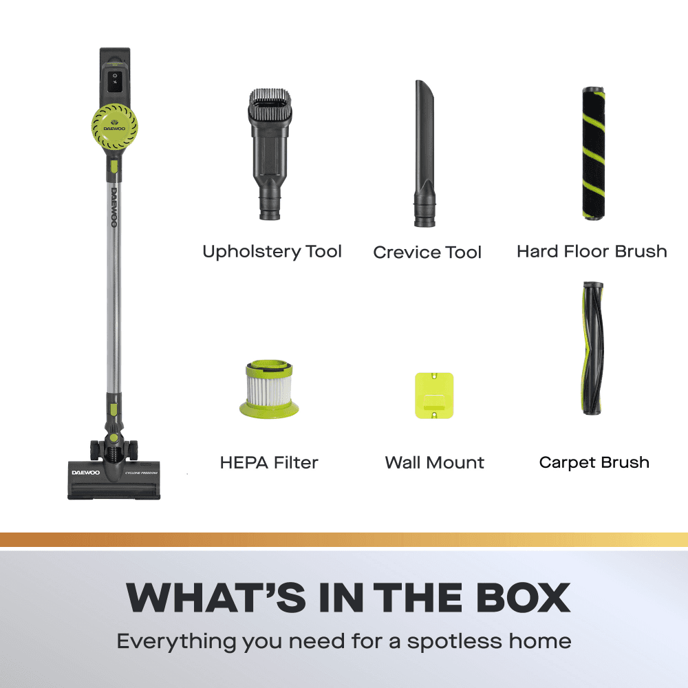 The Daewoo Cyclone Freedom comes with a wall-mounted charging dock, making storage and recharging simple and space-efficient. The washable HEPA filter helps capture allergens and fine dust, promoting a cleaner and healthier home environment.